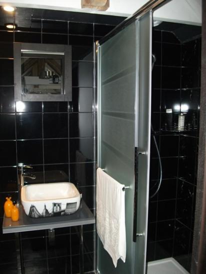 La salle de bain a été crée dans une ambiance métropolitain. Le carrelage rural -all over black-contraste avec le blanc immaculé de la céramique . Succombez à la douche très spacieuse 80X 140 pour un moment en solo ou à partager en amoureux. Les draps de bains et les peignoirs de douche sauront vous ravir Pour un confort optimal, le radiateur sèche serviettes mural est là. .
